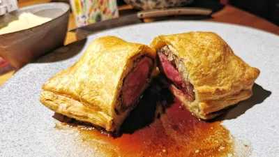 Druga hišna klasika je njihov wellington, govedina v testu, obložena z drniškim pršutom. Okusu in pripravi ne moremo očitati ničesar, wellington je bil popoln, a skorajda prevelik, sploh v kombinaciji s krompirjevim pirejem in v odsotnosti kakršne koli zelenjave. To je tudi edina dražja jed na jedilniku, stane 32 evrov.