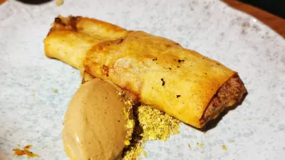 Obe hladni mesni predjedi sta bili solidni, če ne kar sijajni, kanček pa se je zalomilo pri solati. Pred vrati je pomlad in divji šparglji so že na meniju, kot predjed so jih ponudili v solati s poširanim jajcem in sirom comte. Seveda smo se navdušeno strinjali, a potem razočarani ugotovili, da je bilo v tej solati več rukole kot špargljev, teh smo našteli kakšne štiri ali pet primerkov. Veliko več smo dobili s kaneloni, ki so jih bogato napolnili z bakalarjem in oblili s slastnim pudingom iz oljčnega olja. Izjemna jed.