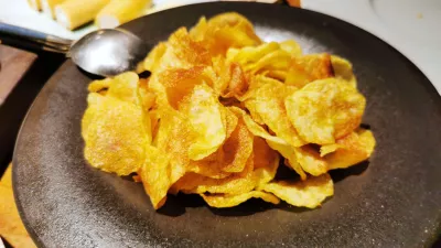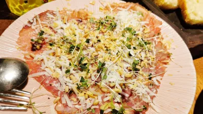 Začeli smo s hišnim, bojda zelo popularnim tatarskim biftekom, ki lahko, ni pa nujno, zadovolji dve osebi, še posebej ob pomoči priloženega kruha. Meso je rahlo pikantno, sveže začinjeno, daleč od kakšne paštetne verzije, pokrijejo pa ga s hrustljavo ocvrtim čipsom iz, bojda, imotskega krompirja. Karpačo je telečji, nanj naribajo sir, v pomoč pri okusu so pinjole.