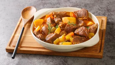Traditional Irish Stew featuring succulent lamb, sweet root vegetables, and an irresistibly rich broth closeup in the pot on the table. Horizontal / Foto: Alleko