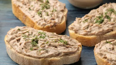 Fresh homemade chicken liver pate with herbs on bread on a blue wooden table. A sandwich. close-up / Foto: Kristina Maksymova