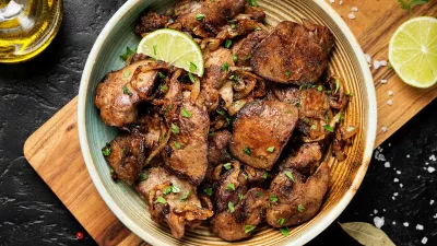 Jetra umijemo pod tekočo vodo in očistimo žile ter ovojnico. Narežemo jih na tanke rezine in za pol ure namočimo v mleko, da se zmehčajo. Čebulo olupimo in narežemo na tanke lističe ter jo popečemo na olju in maslu, da karamelizira. Jetra odcedimo in osušimo s papirnato brisačo ter jih dodamo v ponev s čebulo in popražimo, da spremenijo barvo. Posolimo jih šele povsem na koncu, da ne postanejo trda, in jim dodamo še malo svežega peteršilja, balzamični kis ter okrasimo z rezino limone. Postrežemo jih s pire krompirjem ali pečenim krompirjem.