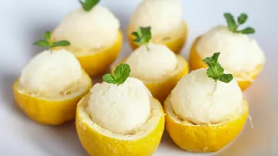 Limone temeljito operemo, jih prerežemo na pol in iz njih stisnemo sok. Lupine oziroma tisto, kar je ostalo v njih, izdolbemo z žlico, da bodo služile kot posodice za naš sorbet. Nato v majhnem loncu zmešamo vodo in sladkor. Sirup segrevamo na srednji temperaturi, dokler se sladkor popolnoma ne raztopi, ne sme pa zavreti. Dodamo naribano limonino lupinico in kuhamo še eno do dve minuti. Posodo odstranimo s toplote in ohladimo na sobno temperaturo. Ko je sirup ohlajen, dodamo limonin sok in dobro premešamo ter ga prelijemo v izdolbene limonine polovice, ki jih postavimo v zamrzovalnik za vsaj štiri do pet ur. Vsako uro sorbet na rahlo premešamo, da bo bolj kremast, pred serviranjem pa ga okrasimo z lističi mete.