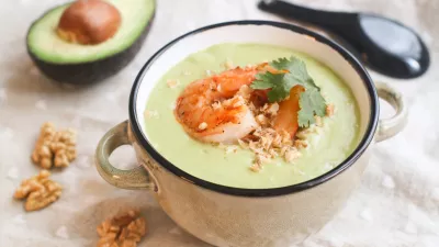 Close up of healthy chilled avocado soup in a bowl with grilled shrimps and ground walnuts, ketogenic diet concept / Foto: Pkheawtasang