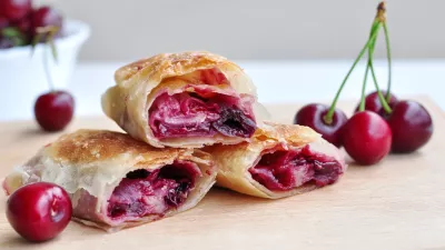 V skledi zmešamo razkoščičene češnje, sladkor, vaniljev sladkor, cimet in oreščke. Če je zmes preredka, dodamo še malce drobtin, da vpijejo vodo. Pečico segrejemo na 200 stopinj Celzija. Listnato testo razgrnemo na rahlo pomokano površino in nanj enakomerno razporedimo nadev, pri čemer pustimo nekaj centimetrov roba na vseh straneh. Testo previdno zvijemo v zavitek in zavihamo konce, da nadev ne bo uhajal, ter ga položimo na pekač, obložen s papirjem za peko. Zavitek premažemo še s stepenim jajcem in ga pečemo približno 30 do 35 minut oziroma dokler ne postane lepo zlatorjav. Ko se nekoliko ohladi, ga posujemo s sladkorjem v prahu. Zraven se odlično poda kepica vaniljevega sladoleda ali žlica sladke smetane.