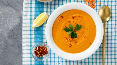 Fresh prepared homemade red lentil soup. top view / Foto: Nelea Reazanteva