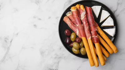 Vsako kruhovo palčko ovijemo z eno tanko rezino pršuta. Če so rezine večje, jih prerežemo po dolžini. Pomembno je, da grisine ovijemo v pršut tik pred serviranjem, v nasprotju s camembertom, ki ga je priporočljivo vzeti iz hladilnika vsaj pol ure prej, položimo pa ga na desko in ga razrežemo v obliki tortice. Zraven ponudimo še skodelico vloženih oljk.