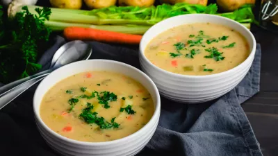 Bowls of vegetable soup with potatoes, celery, carrots, and garlic / Foto: Candice Bell