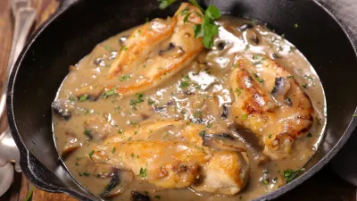 Pečene piščančje prsi v kremni omaki iz šampinjonov