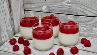 Želatino namočimo v hladni vodi za približno pet do deset minut, da se zmehča. V kozici segrejemo sladko smetano, mleko, sladkor in vaniljo toliko časa, da se sladkor stopi in zmes skoraj zavre. Nikakor pa ne sme močno vreti. Kozico odstavimo z ognja, ožamemo želatino in jo vmešamo v vročo smetanovo zmes, dokler se popolnoma ne stopi. Mešanico precedimo skozi cedilo in nalijemo v štiri kozarce ali skodelice ter pustimo, da se zmes nekoliko ohladi pri sobni temperaturi, nato pa kozarce pokrijemo in postavimo v hladilnik za najmanj štiri ure, da se strdi. Preden panakoto postrežemo, pripravimo še preliv, tako da v manjši kozici na zmernem ognju pokuhamo maline, sladkor in limonin sok, da nastane neke vrste marmelada oziroma omaka. Na strjeno panakoto previdno nalijemo ohlajen malinov preliv in jo okrasimo s svežimi malinami.