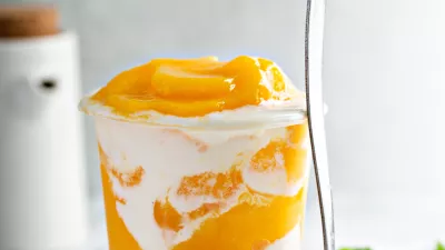 Mango smoothie with whipped coconut cream swirled in a tall cup, refreshing snack or healthy dessert for breakfast / Foto: Veselovaelena
