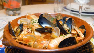 Školjke za 20–30 minut namočimo v hladno, rahlo soljeno vodo, da spustijo pesek, nato jih dobro zdrgnemo pod tekočo vodo. V manjšem loncu segrejemo dve žlici olja, dodamo školjke, posodo pokrijemo s pokrovko in čakamo 3–4 minute, da se te odprejo, nato jih postavimo na stran. Ribe očistimo, jih narežemo na večje kose, prav tako lignje ali sipe, ki jih narežemo na manjše trakove. Kozice ali škampi pa naj ostanejo v oklepih. V večji posodi nato na oljčnem olju počasi popražimo sesekljano čebulo, da postekleni, dodamo sesekljan česen in lovor, pelate ter vse skupaj premešamo in kuhamo sedem minut, da se okusi povežejo. Nato v lonec vržemo lignje ali sipe in jih kuhamo deset minut, zatem pa nežno v lonec položimo še kose rib, dolijemo vino in počakamo, da alkohol izpari. Vsebine v posodi nikakor ne mešamo, ampak samo vsake toliko časa posodo pretresemo. Prilijemo še vodo, tako da so ribe prekrite, dodamo čili in vse skupaj kuhamo na rahlem ognju 25 minut. Nato dodamo odprte školjke in kozice ali škampe ter jih kuhamo še pet minut, po potrebi solimo in popramo ter posodo pokrijemo in pustimo, da naš brodet počiva deset minut.