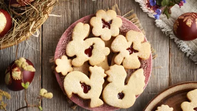 V skledi zmešamo moko, sladkor v prahu, vaniljev sladkor, sol in limonino lupinico. Dodamo hladno, na kocke narezano maslo in s prsti na hitro vse skupaj zgnetemo v drobtine. Zatem primešamo rumenjak in zgnetemo gladko testo, ki ga zavijemo v folijo in postavimo v hladilnik za eno uro. Nato testo razvaljamo na približno tri milimetre debeline in izrežemo oziroma oblikujemo (lahko tudi z modelčkom, po možnosti z velikonočnim motivom) enake pare, pri čemer naj jih ima polovica na sredini luknjo. Piškote pečemo pri 180 °C približno osem do deset minut, da rahlo porjavijo. Počakamo, da se ohladijo, nato jih začnemo sestavljati. Spodnji del premažemo z marmelado in pokrijemo z zgornjim luknjičastim delom, na koncu pa jih še posujemo s sladkorjem v prahu.