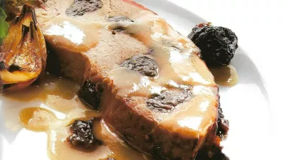 Kos svinjskega stegna natremo s soljo. S tankim nožem naredimo žepke in jih zapolnimo s suhimi slivami brez koščic. Čebulo olupimo in narežemo na četrtine, prav tako olupimo in očistimo česen. Korenčka in koren peteršilja pa operemo, ostrgamo in narežemo na večje kolobarje. Vso zelenjavo pomešamo in damo v pekač. Nanjo položimo stegno z zataknjenimi slivami in vse skupaj prelijemo z vinom. V manjši ponvi segrejemo olje do vročega in z njim prelijemo pečenko. Pekač postavimo v ogreto pečico na 180 stopinj Celzija in pečenko pečemo približno 50 minut. Vmes jo večkrat obrnemo in prelijemo s tekočino. Pečeno pečenko postavimo na toplo, pečeno zelenjavo in omako, ki se je nabrala, pa damo v kozico, ki jo postavimo na ogenj, da omaka zavre, nato pa jo pretlačimo s paličnim mešalnikom. Če je omaka pregosta, jo razredčimo z malce vroče vode. Pečenko narežemo na rezine in jo postrežemo v družbi pire krompirja.