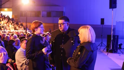 Zadnja usklajevanja med ministrico za kulturo Asto Vrečko, županom Tomažem Vencljem in predsednico idrijskih godbenikov Nives Koželj Bizjak / Foto: Bojan Velikonja