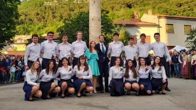 Ko maj varno pritrdijo na svoje mesto sredi trga, ga obkrožijo ter ubrano in srčno zapojejo dolinsko himno. »Eno drevce mi je zrastlo, drevce zeleno. Pod tem drevcem hladna senca, hladna senčica. Tam, kjer spava moja draga, jaz pa zraven nje …« se je letos krepko po polnoči slišalo iz več sto vaških grl. S cerkvenega zvonika sv. Urha pa s pritrkavanjem sporočijo tudi krajanom, ki že spijo, da je naloga opravljena.