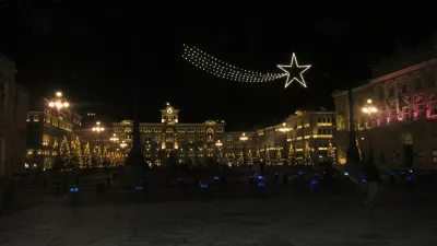 Trg zedinjene Italije; pritajena zvočna kulisa z adventno glasbo in zvezda repatica za decembersko noč nad občinsko palačo z urnim stolpičem in vodnjakom štirih celin, Avstralije takrat, ko so ga sredi 18. st. zgradili, še niso poznali.