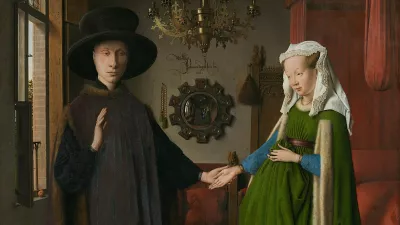 Premaknimo se še stoletje nazaj, v leto 1434, v Brugge. Vstopimo v bogato opremljeno spalnico. Tam stojita moški in ženska. On je verjetno Giovanni di Nicolao Arnolfini, bogat italijanski bankir. Ona je njegova žena. Držita se za roke. Prizor je intimen, tih in nasičen s simboli.