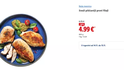 Na vprašanje, kaj bo za kosilo, se odgovor morda glasi: 800 g svežih piščančjih prsnih filejev, ki jih bodo prodajali po 4,99 evra (znižano za 26 odstotkov). Ne spreglejte pa niti sladkega kakija po ceni 0,49 € na kos (- 37 odstotkov).