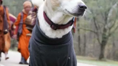 Na poti se rad druži tudi z radovednimi mimoidočimi. Foto: FB/Aloka the Peace Dog