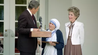 Ameriški predsednik Ronald Reagan je Materi Terezi na slovesnosti v Beli hiši 20. junija 1985 skupaj s prvo damo Amerike Nancy Reagan podelil predsedniško medaljo svobode. / Foto: Wikipedija