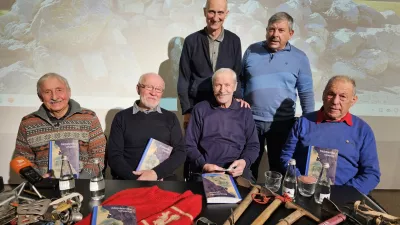 Od leve Janez Dovžan, Janez Brojan, Janko Ažman in Klavdij Mlekuž, zadaj pisec in urednik knjige Vladimir Habjan in Žarko Rovšček, ki je opravil strokovni pregled. / Foto: Manca Ogrin