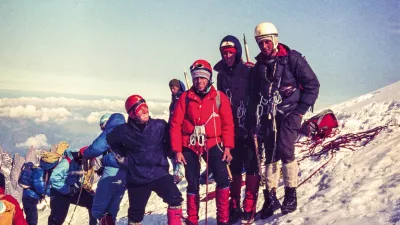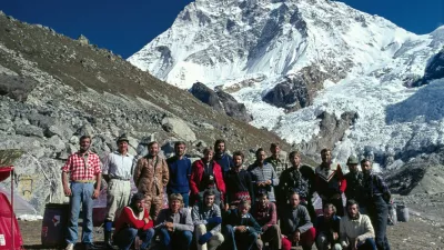 Vrhunec delovanja Mojstranških veveric je bil leta 1975, ko sta Janko Ažman in Janez Dovžan stala na vrhu Makaluja, prvega slovenskega osemtisočaka. Na fotografiji moštvo celotne odprave. / Foto: Slovenski planinski muzej