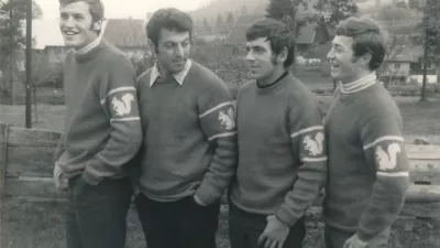 Ustanovna četverica Mojstranških veveric na fotografiji iz leta 1968: Janko Ažman, Klavdij Mlekuž, Zvone Kofler in Janez Brojan v svojih legendarnih rdečih puloverjih z veverico na rokavu. / Foto: Polde Karlin/arhiv Planinskega vestnika