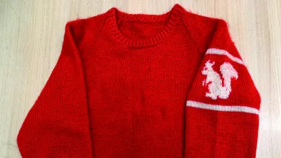 Rdeč pulover z belo veverico na levem rokavu je bil zaščitni znak Mojstranških veveric. Jopice je vsakemu članu spletla mama Janeza Brojana. To je še edini ohranjeni pulover, last Janeza Dovžana. / Foto: Vladimir Habjan