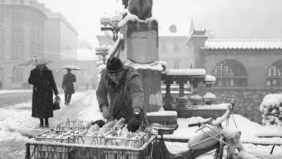 Takole so tovornjaki stresali sneg v Ljubljanico. / Foto: hrani Muzej novejše in sodobne zgodovine Slovenije