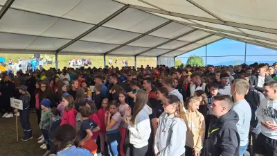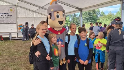 Maskota Flori med tekmovalci in gledalci / Foto: Gasilska Zveza Slovenije