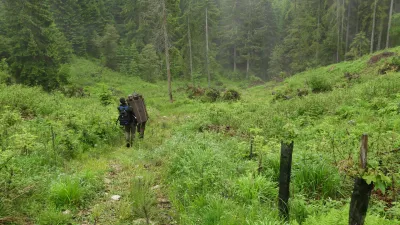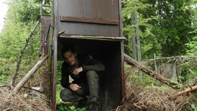 Na grebenu, kjer se ta ponovno spušča v gozd, stoji obdana s suhim smrekovim vejevjem past. Njena vrata so dvignjena, past seveda ni več aktivna. Miha sprva stopi do kamere, da preveri njeno delovanje.