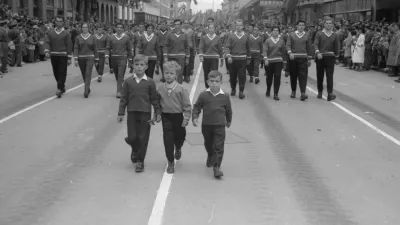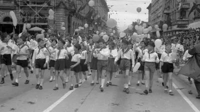 Stotisočglava množica je posebno toplo pozdravila najmlajše udeležence parade, ki so s petjem hiteli po Titovi cesti in v zrak spustili na stotine balonov. / Foto: Marjan Ciglič, hrani Muzej novejše in sodobne zgodovine Slovenije