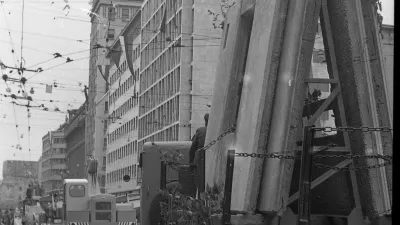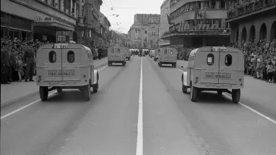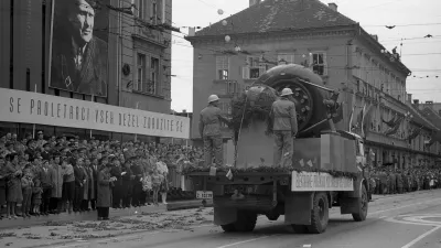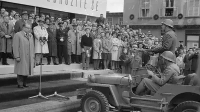 Ko se je pred slavnostno tribuno na Ajdovščini ustavilo vojaško vozilo, so zadonele fanfare in naznanile raport poveljnika vojaškega dela prvomajskega sprevoda. / Foto: Marjan Ciglič, hrani Muzej novejše in sodobne zgodovine Slovenije