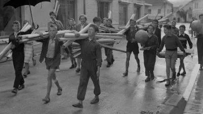 Leto 1960. Učenci iz Logatca se selijo v novo šolo. / Foto: Marjan Ciglič, hrani Muzej novejše in sodobne zgodovine Slovenije
