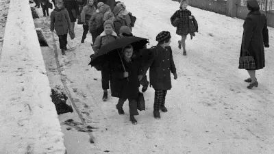 9. januar 1960. Šolarji na poti domov po zasneženi cesti. / Foto: Marjan Ciglič, hrani Muzej novejše in sodobne zgodovine Slovenije