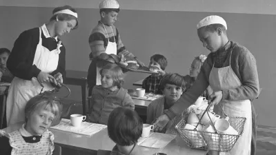 Leto 1960. V osnovnih šolah so starejši učenci pomagali razdeljevati malico sošolcem. / Foto: Marjan Ciglič, hrani Muzej novejše in sodobne zgodovine Slovenije