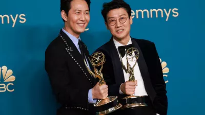 Igralec Lee Jung-jae in ustvarjalec serije Hwang Dong-hyuk / Foto: Reuters