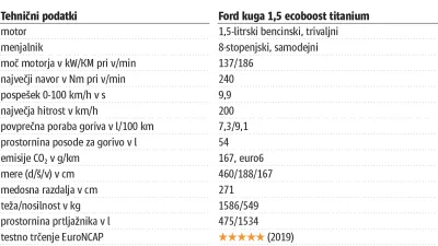 Na cestah se vozi že dolgih 16 let, trenutna generacija pa je tretja, pri čemer je lani doživela kozmetično prenovo, po kateri je še bolj všečna. V Sloveniji sodi med deseterico najbolje prodajanih avtomobilov svojega razreda, lani pa je omrežila približno 547 Slovencev. Tudi zato, ker njena cena ni pretirana. Za testno različico je namreč treba odšteti 29.781 evrov, ob upoštevanju popustov pa še precej ugodnejših 25.650 evrov. In za odštete evre dobite veliko. No, vsaj na papirju. Pri kugi namreč velja, da je manj dejansko več, kar velja kot pribito, ko beseda nanese na motor, 1,5-litrski bencinski trivaljnik. Problem so konji, natančno 186 jih je. Da bi tekli, jih je treba izdatno napojiti, velik zapitek pa na koncu tudi plačati. V našem primeru vsakih 600 kilometrov, saj ima posoda za gorivo skromnih 54 litrov. Če vam je matematika blizu, ste že izračunali, da je bila povprečna poraba 9,1 litra, kar je seveda občutno preveč. Zato se zdi na mestu, da se namesto za motor s 186 konji odločite za zelo podobnega s 150 konji, kar se pri zmogljivostih skoraj ne bo poznalo (še več, pospešek šibkejšega motorja je boljši), pri porabi pač (poldrugi liter). Težava je samo, da ta motor ne premore sicer odličnega osemstopenjskega samodejnega menjalnika, temveč zgolj šeststopenjskega ročnega, kar pa je velik minus. Kot naravna izbira se ponuja hibrid, tudi zato, ker je mogoče doplačati za štirikolesni pogon. Dizla (žal) ni več v ponudbi.