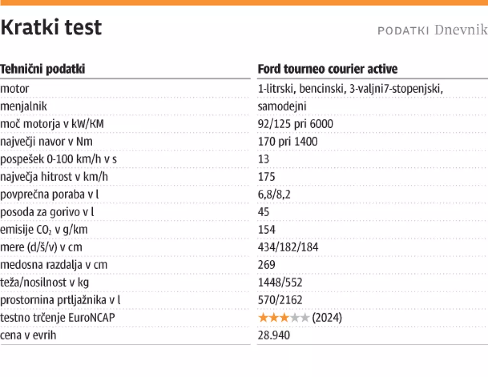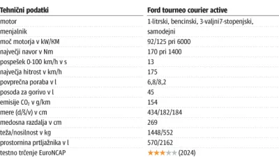 Tourneo courier je torej povsem prikupna izbira za družinski avtomobil. Zlasti če vas ne moti, da med vožnjo vsi mimoidoči menijo, da ste še vedno v službi. Bi pa morda za prevoz družine želeli več kot tri zvezdice na testu EuroNCAP. Za osnovno različico s 6-stopenjskim ročnim menjalnikom je treba odšteti 23.936 evrov. Testni model z opremo Active in 7-stopenjskim avtomatikom pa stane še vedno sprejemljivih 28.940 evrov.