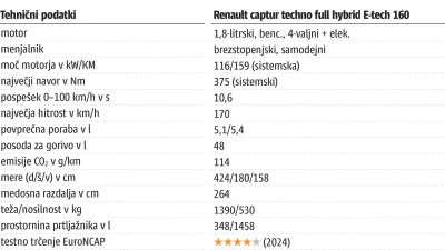 Potem se usedemo v avto in odpeljemo. Takrat se začnejo dogajati zanimive stvari. Na testu sem imel hibridno različico E-tech 160 z brezstopenjskim samodejnim menjalnikom. Avto poganjata bencinski motor s 109 konji (80 kW) pri 5600 obratih in elektromotor s 50 konji (36 kW). Skupno ima torej avto 159 konjev sistemske moči (116 kW) in 375 Nm sistemskega navora. Najvišja hitrost znaša 170 kilometrov na uro, pospešek do stotice pa traja zelo ležernih 10,6 sekunde. Od tega je verjetno kar nekaj časa namenjenega temu, da avto sploh dojame, da smo pohodili stopalko za plin. Je namreč dokaj neodziven. To velja, ko spelješ in tudi ko želiš storiti kaj bolj dinamičnega na cesti. Je kar nadležno, saj je težko napovedati, kako točno se bo avto odzval v danem trenutku. Stvar je tako resna, da sem bil med zavijanji levo izdatno previden, da ne bi nekje sredi manevra ugotovil, da sem capturja prepozno pognal v dir.