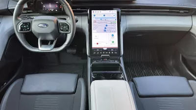 Čeprav z manj kot 4,5 metra dolžine električni explorer ni velikan, bi mu zgolj na podlagi prostornosti v potniški kabini prisodili še kakšen decimeter več, saj se v njem lahko udobno pelje tudi pet odraslih ljudi, pri čemer se bo posebno dobro počutil predvsem tisti, ki bo v vlogi voznika. Za to poskrbi odličen položaj za volanom, preglednost na vse strani in udoben sedež, pa tudi urejena armaturna plošča z gromozanskim osrednjim ekranom, ki spominja na pametno tablico. Ta je hitro odziven, pregleden, zato se nam je prvič po dolgem času zgodilo, da fizičnih gumbov in stikal niti nismo pogrešali, ob tem pa je delno premičen, kar pomeni, da omogoča menjavanje kota, pri čemer se za njim odpre velik skrivni predal. Če kaj, nas je zmotilo, da sta za odpiranje šip na voljo le dva gumba, kar pomeni, da morate za odpiranje zadnjih preklopiti posebno stikalo in nato z istima gumboma, ki sta v osnovi namenjena prednjima šipama, odpirate in zapirate zadnji.
