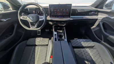 Medtem ko je zunanjost za druge, je notranjost zate. To pomeni osredotočenost na praktičnost in udobje. Zlasti ko je govor o opremi R-line. Vas zanimata masažna in ogrevana prednja sedeža? Sta del opreme. Prav tako triconsko uravnavanje temperature, matrične luči ter sistem za samodejni vklop in izklop dolgih luči. Ob tem so avto podaljšali za 15 centimetrov, na 4,92 metra, kar pomeni medosno razdaljo 2,84 metra oziroma pet centimetrov več prostora za zadnje sedeže. Da boste imeli pri roki odziv na otroške pripombe, da jim ničesar ne privoščite, ko se boste med vožnjo pustili masirati. Lažji bo tudi obvezni tetris pred dopustom. Prtljažnik namreč pogoltne 690 litrov. Če položite zadnje sedeže, celo 1920 litrov. Je pa passat še vedno volkswagen, kar pomeni popolno digitalizacijo klimatskega nadzora in veliko tablico osrednjega potovalnega računalnika, ki je nekaterim plus in znak prestiža, drugim pa še en vsiljiv zaslon. So pa vsaj gumbi na volanu klasični. Tudi ročka samodejnega menjalnika za volanom je izjemno posrečena. Omogoča skoraj popoln izkoristek prostora med prednjima sedežema za odlagalne površine. Kot sem rekel, praktično. Da so imeli pri snovanju passata prste vmes Škodini ljudje, razkriva drobno darilce v obliki dežnika, ki voznika čaka v sprednjih vratih.