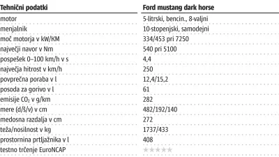 Vendar s tem je treba živeti. Mustang dark horse ni avto za vsak dan. Je avto za sladokusce, ki znajo ceniti mesene užitke vožnje. Tak avto bi našel kupce, tudi če bi se sanje o avtonomnih vozilih nekoč uresničile. So pa cene takšnega veselja v zadnjih desetletjih že presegle žepe likov iz pesmi Brucea Springsteena. Za osnovno različico s samodejnim menjalnikom je treba odšteti 83.600 evrov, za osnovno različico ročnega mustanga GT pa 68.700 evrov.