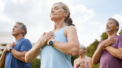 Seniors meditating peacefully outdoors in a park with hands on heart chakra. Elderly group of healthy people holding hands on chest with eyes closed during yoga class. Wellness activity for older adults in open green space, mindfulness and gratitude concept.