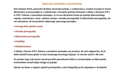 Sledi še grožnja z vpisom v register spolnih prestopnikov (javno dostopen register spolnih prestopnikov pri nas ne obstaja), pošiljatelj pa grozi z objavo vaše fotografije na družbenim omrežjih, da »bodo vsi sorodniki vedeli, kaj počnete z napravo«.  Skratka, elektronsko pošto takšne ali sorodne vsebine mirno ignorirajte.