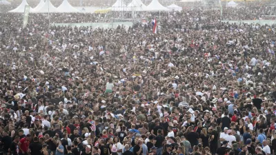 Naši ekipi je uspelo najti tudi točko, kjer smo lahko prevzeli novinarske akreditacije, za katere še teden dni pred koncertom nismo bili prepričani, da jih bomo sploh dobili – medtem ko smo jih sprva v soboto iskali na povsem napačnem koncu prizorišča. A na koncu se je vse izteklo ugodno. Okoli 20.00 nas je varnostnik pospremil do novinarske tribune, s katere se je nudil kakovosten pogled na prizorišče – ki še nikakor ni bilo polno. Do takrat je prišlo vanj okoli 250.000, morda največ 300.000 ljudi, zadnja četrtina pa je bila še vedno precej zračna.