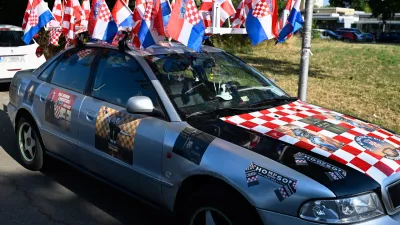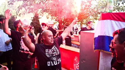 Tudi razpoloženje na vlaku je bilo brez zadržkov. »Za dom!!?« je vzklikal naravni vodja Šole, vlak pa mu je gromko odgovarjal: »Spremni!«, čemur je sledil še ustaški zimzelenček »Evo zore, evo dana«. Ko je grlenost pojenjala, je vodja vzkliknil: »Da ne bi raje Bobana Rajovića, a?!« Nelagodno se počutiš, ko je očitno, da si edini, ki ne poje. In edini, ki nima tipske majice. In povrhu tega še s kolesom na vlaku. Mimogrede – če vzamemo v obzir, da tovrstne majice v povprečju stanejo dvajset evrov, je bilo na koncertu zgolj te robe za protivrednost desetih milijonov evrov. In dodatno so jih prodali še nekaj deset, če ne kar nekaj sto tisoč. Na dan koncerta tudi po petdeset evrov.