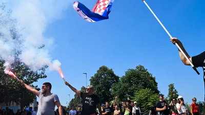 Zunaj so se v vrstah čakajočih že kazale napetosti – čakanje na resda zahajajočem, a še vedno močno žgočem soncu je bilo naporno. Menda so proti koncu začeli spuščati ljudi tudi brez kontrole vstopnic. Večina jih je upoštevala navodila in ni imela nahrbtnikov. Jasno pa je bilo, da so gledalci uspeli vnesti pirotehniko – predvsem bakle –, videti pa je bilo tudi osebne raketomete in zasebne drone v zraku. Iz ozvočenja so spuščali zaslužne domoljubne pevce, kot so Zlatko Pejaković, Kićo Slabinac, Oliver Dragojević, pa tudi Marjan Ban in Daleka obala.