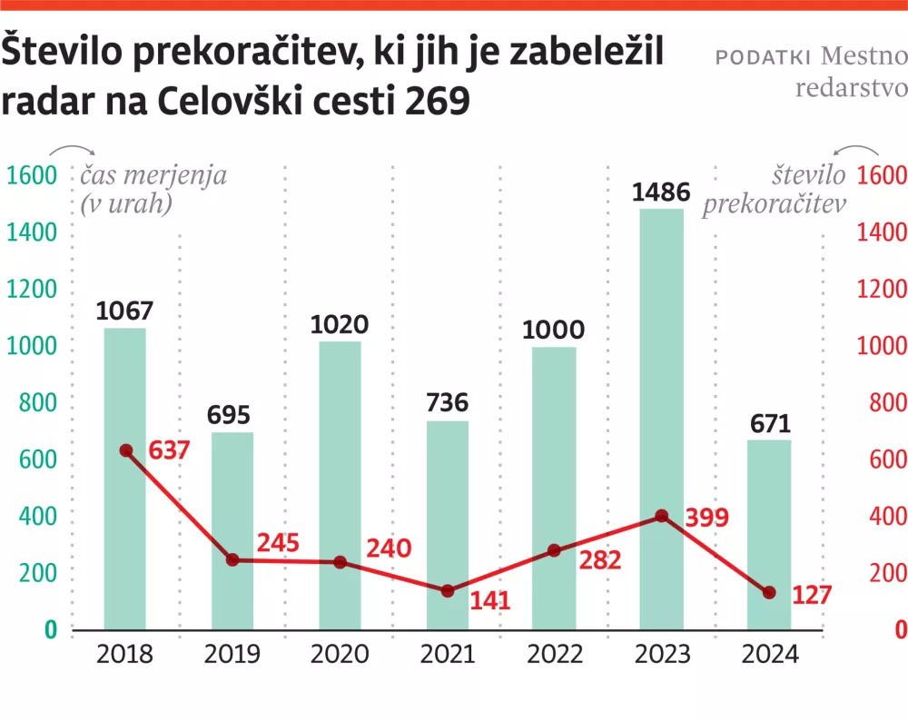 Lani je samodejni radar na Celovški cesti hitrost mimoidočih avtomobilov meril 671 ur. V tem času je zaznal 127 prekrškov. V primerjavi z letom 2023 gre za izrazit upad, saj je takrat radar zabeležil 399 prekoračitev. Vendar je treba upoštevati, da je radar na Celovški cesti leta 2023 hitrosti vozil meril bistveno več ur kot lani, in sicer kar 1486 ur. Če preračunamo, koliko prekrškov je radar na Celovški cesti zaznal glede na opravljeno število ur meritev, je do leta 2021 opaziti upad števila prekrškov, nato je bilo leta 2022 prekrškov nekoliko več, do lanskega leta pa je spet opaziti trend upadanja, kažejo podatki mestnega redarstva.